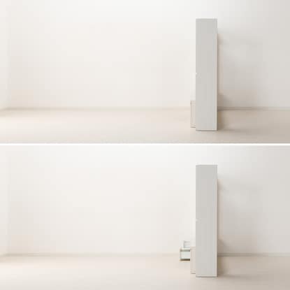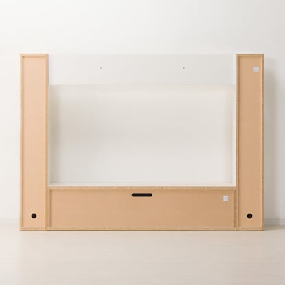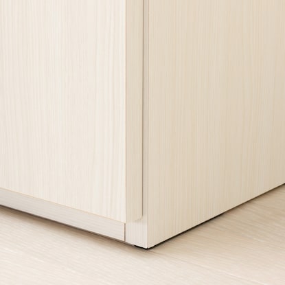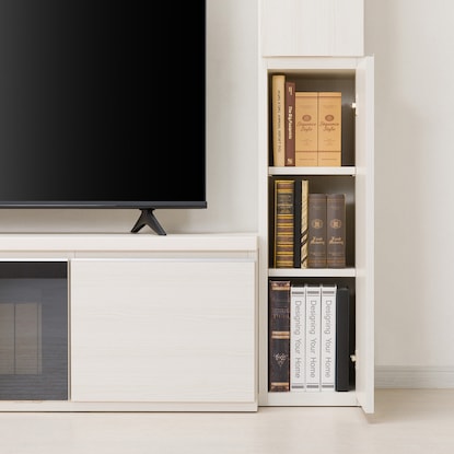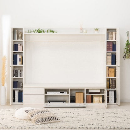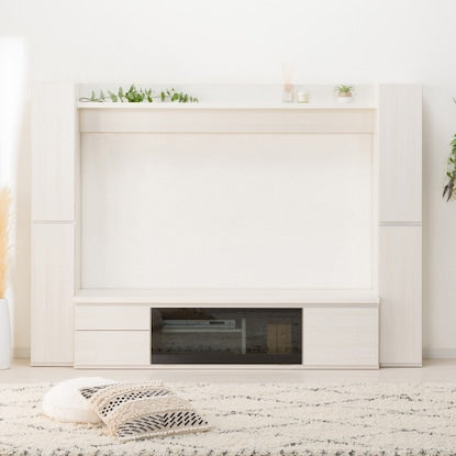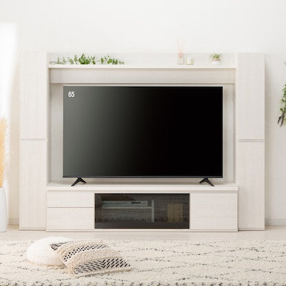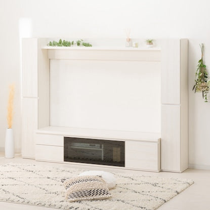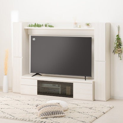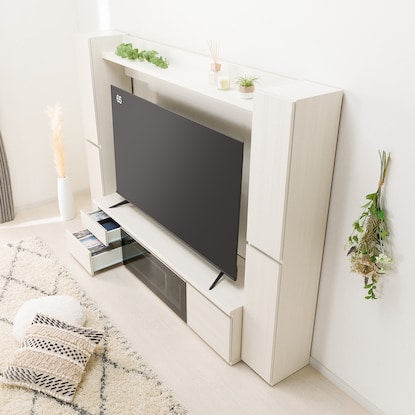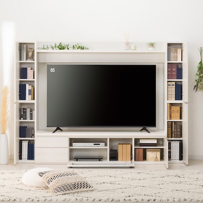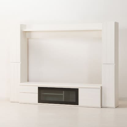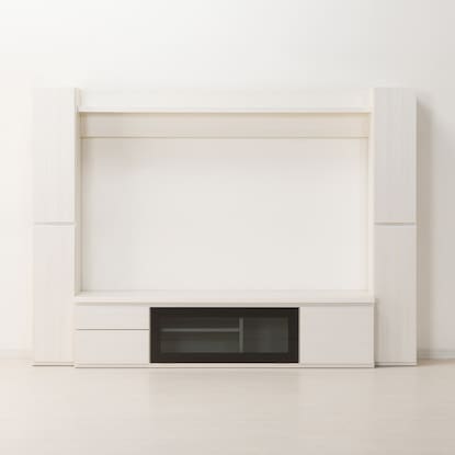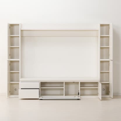 壁面を有効活用!サイドキャビネットを横付けにし、天板上に大型TVを置くスペースを確保しました。 左右の縦型キャビネットに引き出しやAV機器を設置できるフラップ扉の大容量収納。 TV周りをすっきりまとめられます。■最大75V型まで