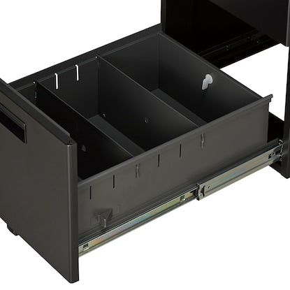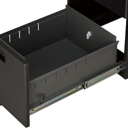 ・大容量で使いやすいスチール製のデスクワゴン。 ・作業スペースと収納を兼ね備えたブラックボディ ・キャスター付きで移動もらくらく。 ・鍵が不要で管理しやすいダイヤル式。・全ての引出しが施錠されるオールロック機能付きでセキュリティ面も安心です。・全段フルオープンスライドレールを採用。 ・A4ファイルが横向きに収納できます。 ・仕切り板は1段につき1枚付属。 ※仕切り板が不要な際は、下段奥にまとめて固定できます。 ・引出し内寸 上・下段:幅31.5×奥行42×高さ26cm 完成品
