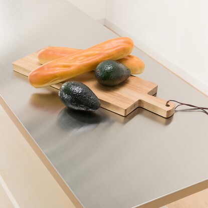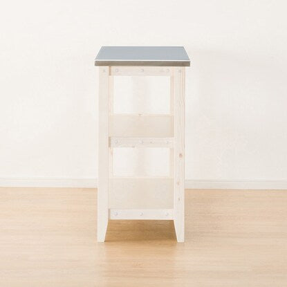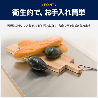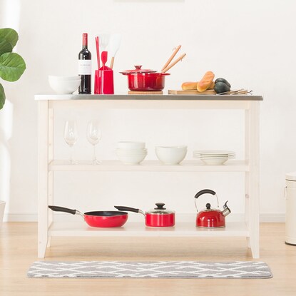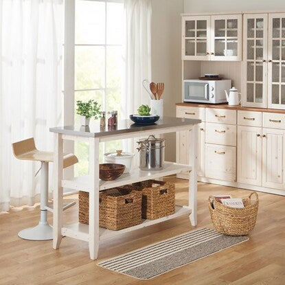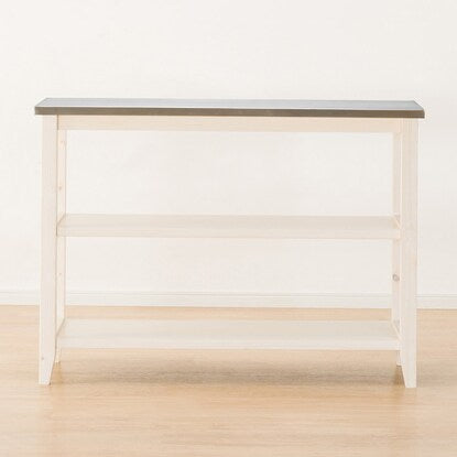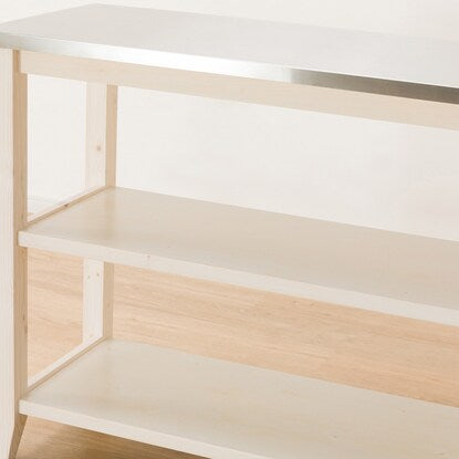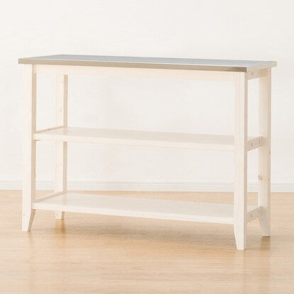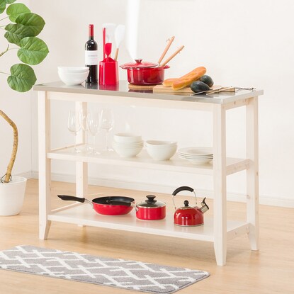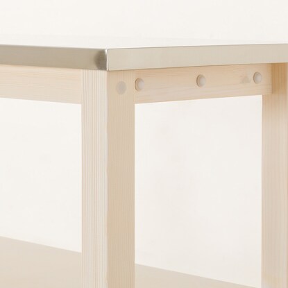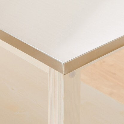 ※チェア、その他使用している小物等は演出品です。お料理の作業台としても、軽食や書き物をするテーブルとしても使えます。強度が高く錆び付かないステンレス天板と、 フレームにはやさしい天然木素材を使ったフリーテーブルです。シンプルで使い勝手のよい収納スペース。【詳細サイズ(約)】 ■棚内寸 上段:幅106×奥行38×高さ31(有効内寸35)cm 下段:幅106×奥行38×高さ31cm ■天板の厚さ:2.5cm ■脚高:11cm