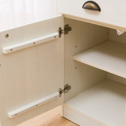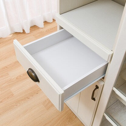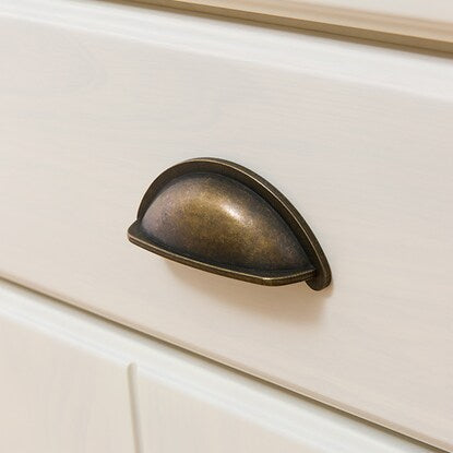 落ち着いたやさしい雰囲気にしてくれる、オシャレな貝ハンドルの取っ手が引出しに付いています。