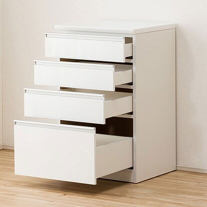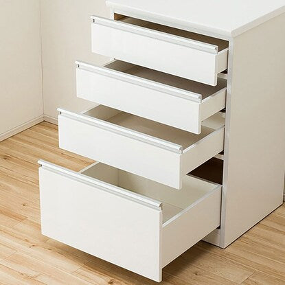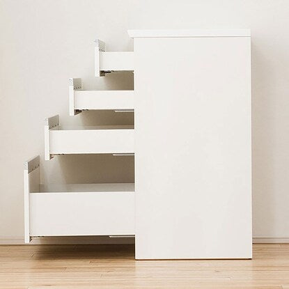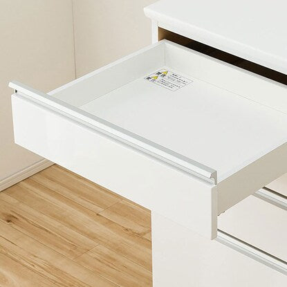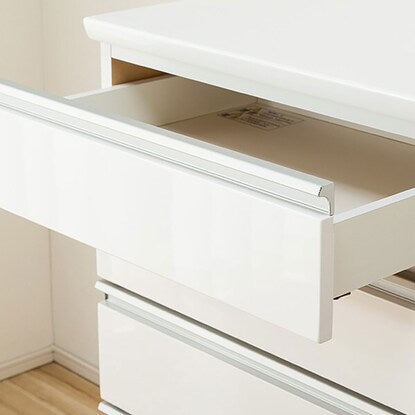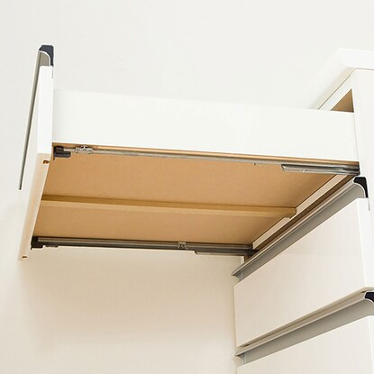 引出しに世界的メーカーヘティヒ社と共同開発したレールを使用しています。全段奥の物が出し入れしやすいフルオープンタイプ、また耐久性の高い底受け構造レールが引出しの荷重を分散して受け止めます。引出しの1・2段目は、押すだけでゆっくり閉まるソフトクローズ仕様の高機能レールです。