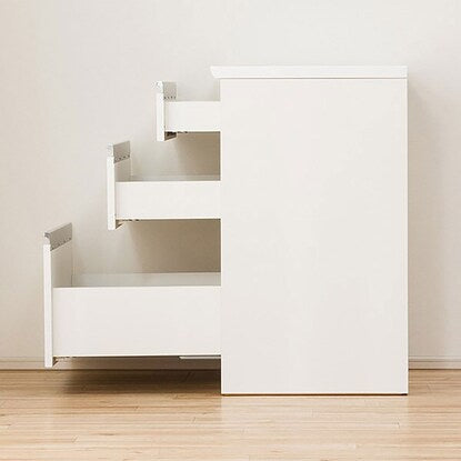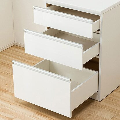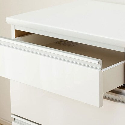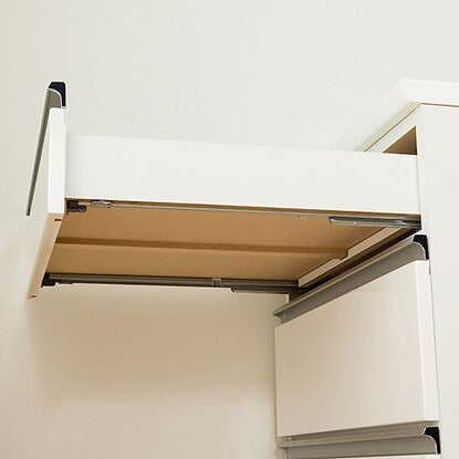 引出しに世界的メーカーヘティヒ社と共同開発したレールを使用しています。全段奥の物が出し入れしやすいフルオープンタイプ、また耐久性の高い底受け構造レールが引出しの荷重を分散して受け止めます。引出しの1段目は、押すだけでゆっくり閉まるソフトクローズ仕様の高機能レールです。