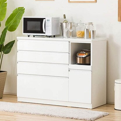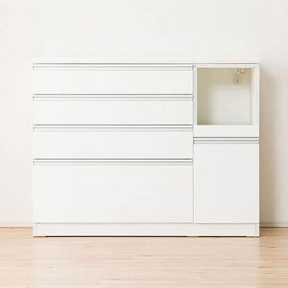 スライドテーブルは、炊飯ジャーなどフタ付き製品や、蒸気が出るキッチン家電を置くのに最適です。配線穴付きなので、コードを後ろに通すことができます。