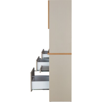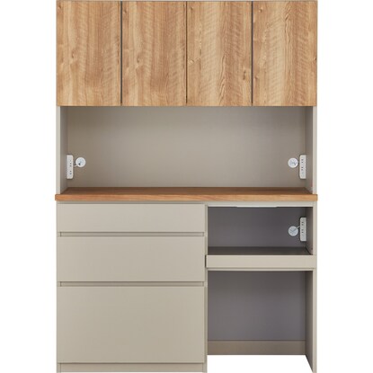 木目シートの前板と天板、ベージュの本体は様々なスタイルでコーディネートできます。