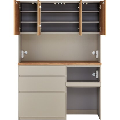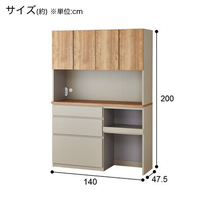 中身を隠してすっきり収納できる板扉仕様で、食器などをしまう時や出すときに、仮置きできるスペース付き。