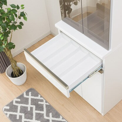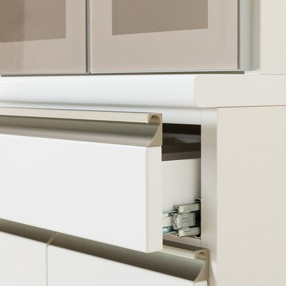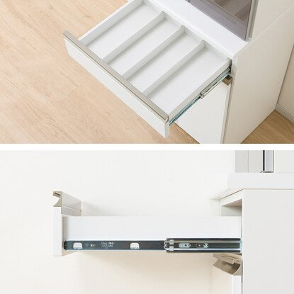 奥まで引出せるフルスライドレール、引出しは勢い良く閉めても直前で減速し、静かにピッタリ閉まるソフトクローズレールを使用。