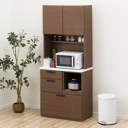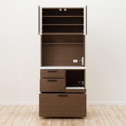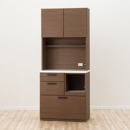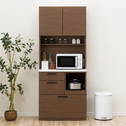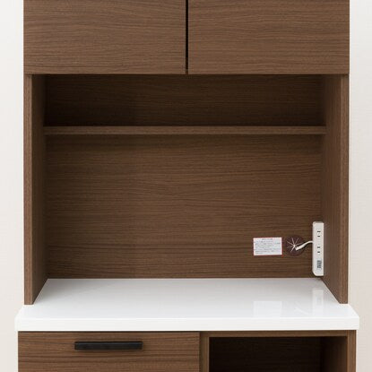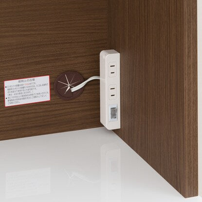 上台は中身を隠してすっきり収納できる板扉仕様。オープンスペースはコンセント2口と配線穴付きで、家電のコードを背面に通すことができます。
