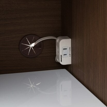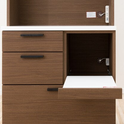 スライドテーブルは、炊飯ジャーなどフタ付き製品や、蒸気が出るキッチン家電を置くのに最適。背面に配線穴が付いているので、コードを後ろに通すことができます。