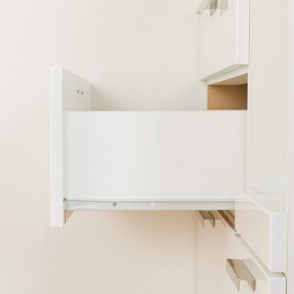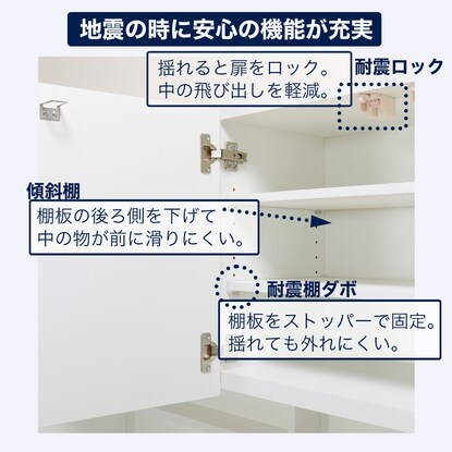 扉には地震の時も安心のロック機能付きで、中のものが飛び出しにくく安心です。