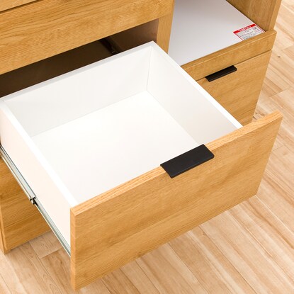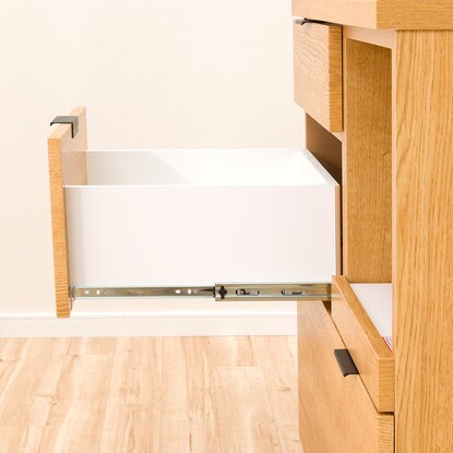 1段目と3段目に世界的メーカーHettich社製のレールを使用。引出しの荷重を分散して受け止める底受け構造、奥の物も出し入れしやすいフルオープンタイプです。