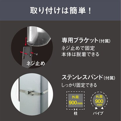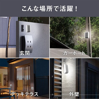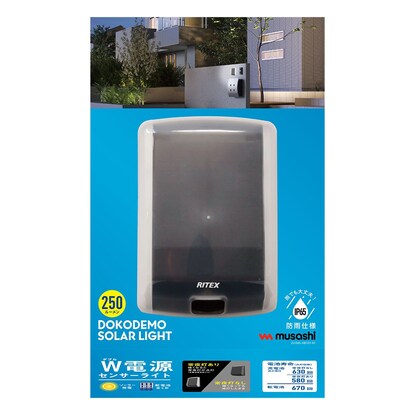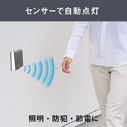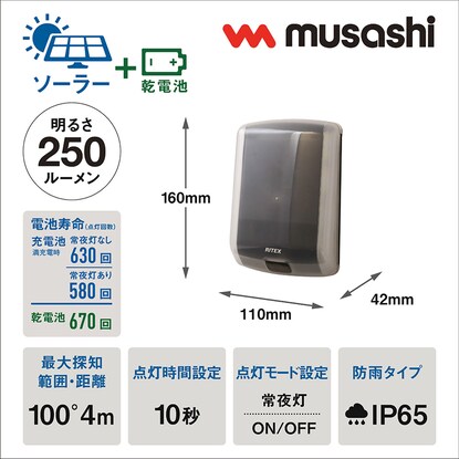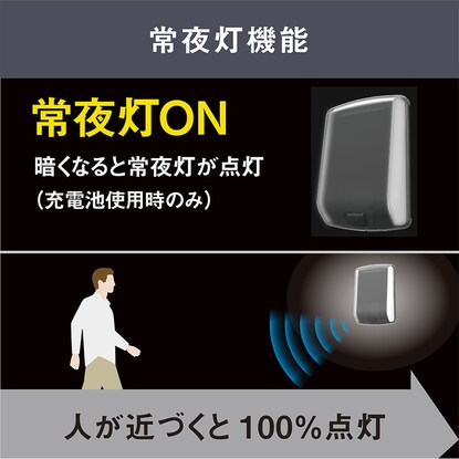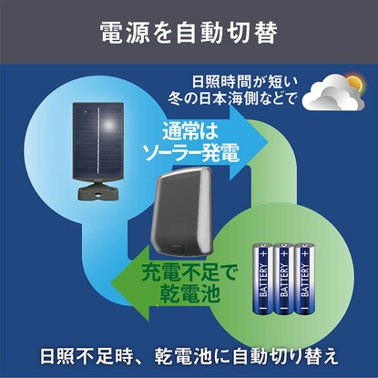 日照不足に強いダブル電源(ソーラー+乾電池) センサーで自動点灯。照明・防犯・節電に 暗くなると常夜灯が点灯する常夜灯機能あり(充電池使用時のみ) 防雨型(IP65)※ソーラーパネルに直射日光が当たらない場所では使用できません。【使用方法(モード切替)】 ON (常夜灯):周囲が暗くなると自動でほんのりと常夜灯が点灯し、人が来るとセンサーが探知し点灯します。人がいなくなると10秒後に消灯します。そのまま人がいると、点灯時間は延長されます。 ON:周囲が暗い時に人が来るとセンサーが探知し自動で点灯します。 常夜灯はOFF です。 OFF:電源を切ります。【センサー探知範囲】 探知範囲は、最大100°×最遠4mの範囲で人や動く熱源を探知します。 取り付け高さは2m以下です。探知させたい方向にセンサーを向けてください。 取り付け高さが低いと探知範囲は狭くなります。 夏場、周囲の温度が高くなると、探知が鈍くなります。 本体に向かって人が直進した場合は探知が極端に短くなります。左右に横切る所に取り付けてください。 エアコンや揺れるカーテンや植物の近くは誤動作や消灯しない原因になります。【仕様】 電球:3W(高輝度白色LED、全光束 250ルーメン、常夜灯2ルーメン、設計寿命4万時間) 電源 充電池:リチウムイオン電池 3.7V/1500mAh 乾電池:単3形アルカリ乾電池×3本(別売) ソーラーパネル:結晶太陽電池 5V/0.9W 充電池寿命(点灯回数) 常夜灯なし: 春夏秋 平均約90回/冬 平均約60回/満充電時 約630回 常夜灯あり: 春夏秋 平均約55回/冬 平均約25回/満充電時 約580回 ※春夏秋=充電可能な平均日照時間 約3時間 (東京) 冬=充電可能な平均日照時間 約2時間(東京) 乾電池寿命(点灯回数):約670回 ※使用環境や電池の性能により異なります。 充電寿命:充放電サイクル 500回 探知方式:焦電型赤外線センサー 探知範囲:最大100°最速 4m(取り付け高さ2m時) モード切替:ON(常夜灯) / ON / OFF 点灯時間:10秒固定 設置場所:屋内/屋外(保護等級 IP65) サイズ:高さ160×幅110×奥行42mm 重量:約255g 付属品: ・ステンレスバンド (長さ1m)×1 ・取り付けネジ×2 ・コンクリート用プラスチックプラグ×2※取り付け場所は、 万が一落下しても安全な場所に取り付けてください。 ※3か月以上バッテリー残量が少ない状態で保管すると、充電できないおそれがあります。3ヶ月に一度は充電してください。