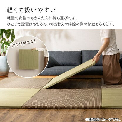 織り目の方向を変えて並べると、光の当たり方などによっては市松模様のようにも見え、単色の置き畳でも違った雰囲気を楽しめます。