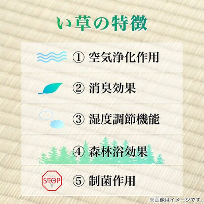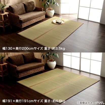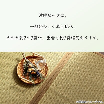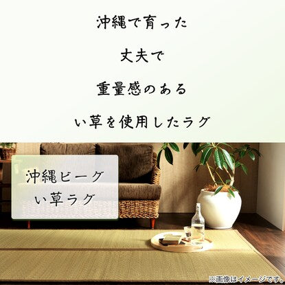 沖縄で育った 丈夫で 重量感のある い草を使用したラグ 沖縄ビーグは、 一般的な、い草と比べ、 太さが約2~3倍で重量も約2倍程度あります。 裏面に不織布の滑り止めを使用しており、クッション性と滑り止め効果を両立しています。 ホットカーペットカバーとしてもご使用いただけます。 ※画像はイメージです。 沖縄で育った丈夫で重厚感のあるい草を使用したラグです。 沖縄ビーグは、一般的ない草と比べ、太さが約2~3倍で重量も約2倍程度あります。 い草の特徴 ①空気浄化作用、②消臭効果、③湿度調節機能、④森林浴効果、⑤制菌作用などがあります。 裏面に不織布の滑り止めを使用しており、クッション性と滑り止め効果を両立しています。 ホットカーペットカバーとしてもご使用いただけます。