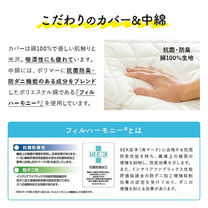 側生地は抗菌防臭加工された綿、キルト内中綿は高機能で衛生的な「フィルハーモニー®」を使用