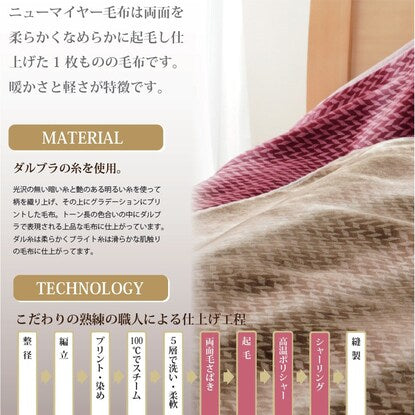 暖かさと軽さが特徴、1枚物で両面を柔らかく滑らかに仕上げたニューマイヤー毛布です 光沢の無い暗い糸と艶のある明るい糸を使って織り上げ、グラデーションにプリント、ダルブラで表現される上品な毛布に仕上がっています 導電性微粒子を使用しパチパチする静電気の不快感を軽減します ご家庭で洗濯可能なのでいつも清潔にご使用できます■日本製:毛布の町、泉大津で熟練の職人が織り、起毛加工で仕上げた毛布です ■素材:パイル糸(毛羽部分) アクリル100% 地糸 ポリエステル100% ■洗濯の際には中性洗剤でネット使用の上、必ずご使用の洗濯機の取扱説明書に従ってお洗い下さい