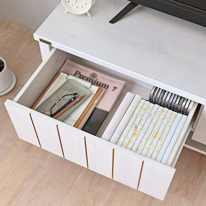 ※イメージ画像の場合、使用している小物等は演出品です。シンプルでありながら収納力に優れたローボード。散らかりやすいリビング周りもスッキリ解消します。木目感にこだわったプリント紙化粧繊維板を使用。どんなお部屋にも馴染むシンプルながら温もりあるデザインです。 約45cmの高さを抑えたサイズ設計。床面に近く、圧迫感を与えにくいのがポイント。狭いお部屋でもインテリアの雰囲気を損ないません。 テレビのリモコンや雑誌など、雑多なモノを収納できる引き出し付き。スライドレールが付いているのでスムーズに開閉できます。■引き出し内寸(約):幅48.5×奥行33.5×高さ13.2(有効内寸15)cm×2杯 AV機器を収納するスペースは、熱がこもりにくく配線しやすいオープンタイプとなっています。■オープンスペース(約):幅52.4×奥行31.8×高さ11.9cm×2 天板にコード抜き用の欠き込みがあり、背面には幅木避けの加工を施しているので、AV機器の配線コードをスムーズに誘導できます。 脚高なのでお掃除も簡単。床全体を清潔に保てます。一般的なロボットクリーナーも入れる高さです。■脚高(約):10cm【耐荷重】 ・天板 :40kg ・引き出し:3kg ・棚板 :10kg 【テレビサイズ目安】 ・43インチまで 同シリーズのセンターテーブル・キャビネットと合わせてお部屋をコーディネートできます。 こちらの商品は、メーカーの倉庫より出荷後、発送完了の旨をメールにてご連絡します。それ以降の注文キャンセルは、お承り出来ません。 一度お受取りの上で、「問合せフォーム」にて返品をお申し出下さい。