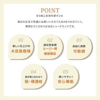 固定棚1枚、可動棚5枚で靴の高さに合わせ調整可能