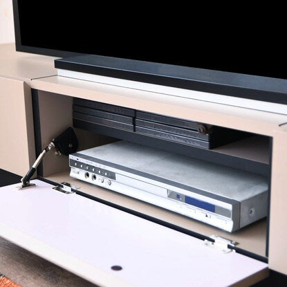フラップ収納内部には、可動棚が1枚付き。扉はソフトダウンステーを使用しており、途中で手を離してもゆっくり開きます。