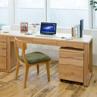※イメージ画像の場合、使用している小物等は演出品です。 ※画像はライトブラウンを使用しています。 天然木「タモ突板」を使用。木材の質感を活かした仕上がりです。天然木ならではのナチュラル感は、様々なテイストのインテリアに合わせやすく、長くお使いいただけるシンプルなデザインに仕上がっています。・天板 :タモ突板 ・前板・脚部:天然木無垢材書籍やパソコンを置いても余裕のある広さ。作業効率が上がる快適なデスク環境を作ることができます。引出しはA4サイズがすっぽり入る広さで、散らかりやすいデスク周りの収納に役立ちます。スライドレールが付いているため、開閉もスムーズ。取っ手は掘り込みタイプのスッキリとしたデザインを採用。扉からの出っ張りが無いため、作業の邪魔になりません。【引出し内寸と杯数】 ■幅90cm :幅29×奥行36×高さ4cm×2杯 ■幅120cm:幅26×奥行36×高さ4cm×3杯 ■幅150cm:幅36×奥行36×高さ4cm×3杯 ■幅180cm:幅33×奥行36×高さ4cm×4杯 こちらは幅150cmです。 ↓↓↓組み合わせて使えるシリーズ商品はこちら↓↓↓ 同シリーズと組み合わせるとさらに便利にお使い頂けます。 こちらの商品は、メーカーの倉庫より出荷後、発送完了の旨をメールにてご連絡します。それ以降の注文キャンセルは、お承り出来ません。 一度お受取りの上で、「問合せフォーム」にて返品をお申し出下さい。