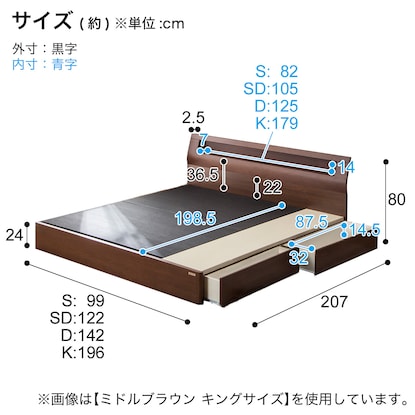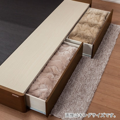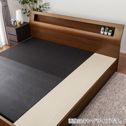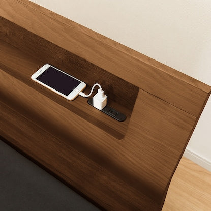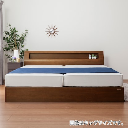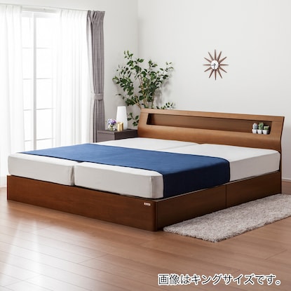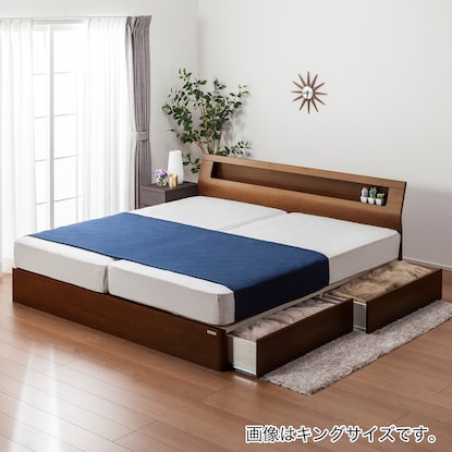 引出しは左右どちらでも取り付け可能です。※こちらは引出し付き・シングルサイズです。 ※マットレスは別売りです。ウォールナット材 流れるような美しい木目をもつウォールナット材がインテリアの雰囲気を高めます。 フルオープン引出し 衣類や寝具等を収納するのに便利です。 フルオープンスライドレール式で奥まで引き出せ、中身がひと目でわかり出し入れもスムーズです。 幅木よけ ヘッドボード側板には幅木をかわすための加工がされていますので、 壁面と隙間なく設置することが出来ます。コードを通すこともできます。 ※高さ7.5cm、厚み1cmの幅木まで対応します。 棚 携帯電話小物を置くのに便利です。 奥行き:7cm スライドカバー付き2口コンセント 携帯電話の充電に便利です。 差込口は埃の入りにくいスライドカバー付き。 ※コンセントの位置はS・SDサイズは右側、D・Kサイズは中央になります。■引出し内寸:幅87.5×奥行32.0×高さ14.5cm ※シングル・セミダブル・ダブル・キングすべて引出し内寸は同じサイズです。 ■引出しあり:床から床板までの高さ24cm