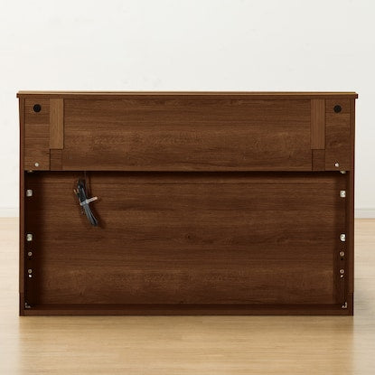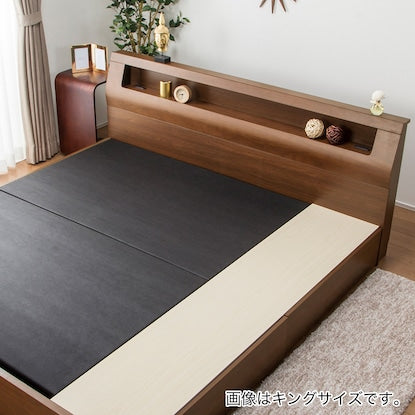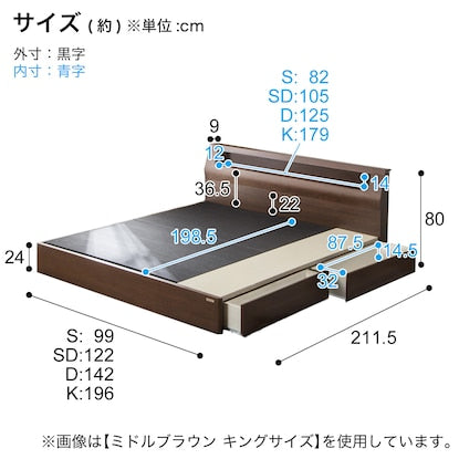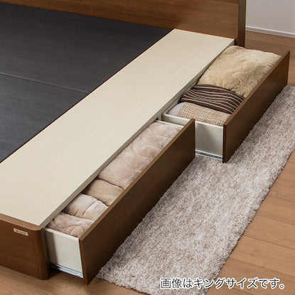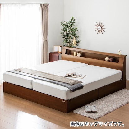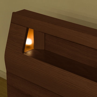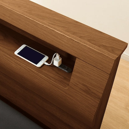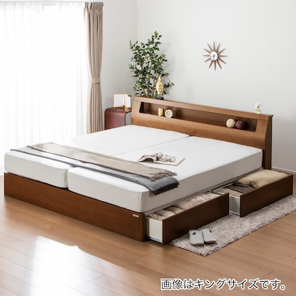 ※画像はキングサイズ(引出し付き)を使用しています。 ※マットレスは別売りです。 棚・照明・コンセント付きベッドフレームです。 流れるような美しい木目をもつ「ウォールナット材」がインテリアの雰囲気を高めます。引出し付き・引出し無し の選べる2タイプ。 サイズはシングルからキングサイズまで幅広くご用意致しました。■床から床板までの高さ:24cm ■マットレス推薦の高さ:25~27cm省エネタイプのLED照明を採用。枕元に置いておきたい携帯電話・眼鏡などの小物を置くのに丁度良い奥行きです。■上段奥行き:7cm ■下段奥行き:12cm差込口は埃が入りにくいスライドカバー付きです。 充電しながら携帯電話などが使えます。※コンセントの位置は、S・SDサイズは右側一箇所、D・Kサイズは左右各一箇所、合計2箇所になります。ヘッドボード側板には幅木をかわす為の加工が施されています。 壁面を隙間なく設置することができ、コードを通すこともできます。※高さ7.5cm、厚み1cmの幅木まで対応します。お部屋の収納量がアップする引出し付きタイプ。 衣類や寝具等を収納できる、幅の広い引出しが2杯付いています。 奥までしっかり開閉できる、フルオープンスライドレール式。 ※引出しは左右どちらでも取り付け可能です。■引出し内:幅87.5×奥行32×高さ14.5cm こちらはセミダブルサイズ(引出し付き)です。