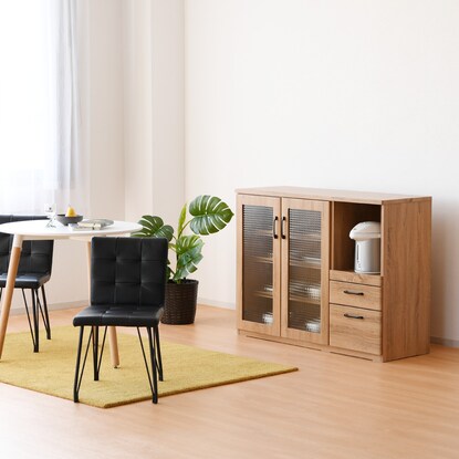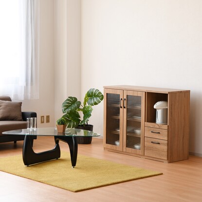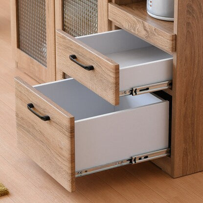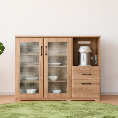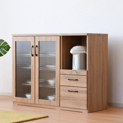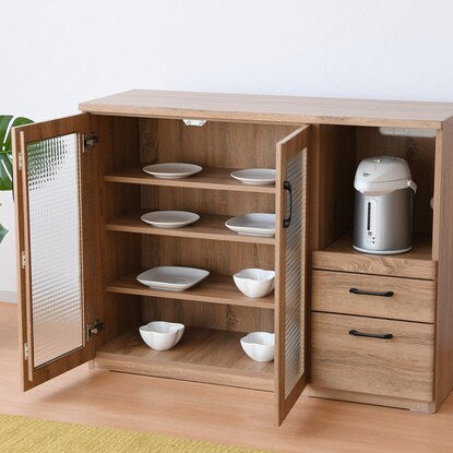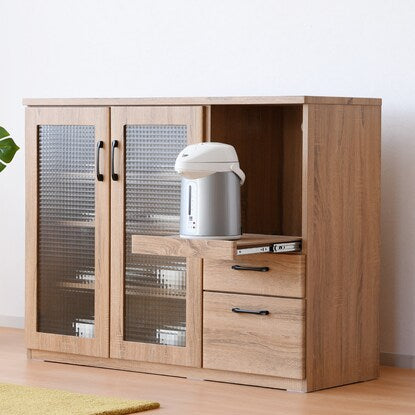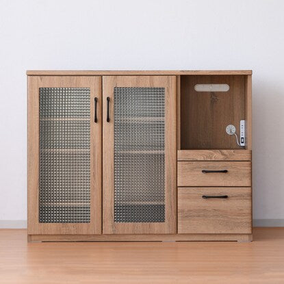 ※使用している小物等は演出品です。食器も家電もたっぷり収納できるカウンター。 天然木調の質感と型板ガラスが温かみのあるナチュラルな雰囲気を演出。 中のものが見えすぎず、一石二鳥。 オープン部には1500W2口コンセント付き。 引き出しはフルスライドレール仕様で奥のものも楽に取り出せます。 届いてすぐご使用できる完成品。(取っ手のみ取り付け) 可動棚3枚<内寸サイズ> 引き出し:(上)幅30.5×奥行32.5×高さ7.5(有効高さ8.5)cm (下)幅30.5×奥行32.5×高さ16.5(有効高さ18.5)cm オープン部:幅35.5×奥行39×高さ40.5cm <耐荷重> 天板:約30kg スライド棚・棚板(1枚当たり):約10kg 同シリーズはこちら