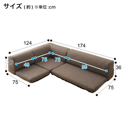 ※画像はブラウンを使用しています。 【各サイズ(約)】 ------------------------------------------------- ・1人用 :幅49×奥行75~101×高さ30~36cm ------------------------------------------------- ・2人用 :幅99×奥行75~101×高さ30~36cm ------------------------------------------------- ・コーナー :幅75×奥行75×高さ36cm ------------------------------------------------- ・共通サイズ:座面の高さ8cm、座面奥行き49cm -------------------------------------------------■座面は底付き感の少ない厚さ8cmのボリュームタイプ。 ■分割式だから左右どちらのコーナーにもお使い頂けます。 ■ローテーブルやコタツなどにも最適です。 ■コーナタイプには背面に便利なポケット収納付き。(×6個) ■底面には、ズレ防止の面テープ付き。■背もたれを倒すと、横になるのに丁度良い角度になります。 ■合皮タイプもございます。