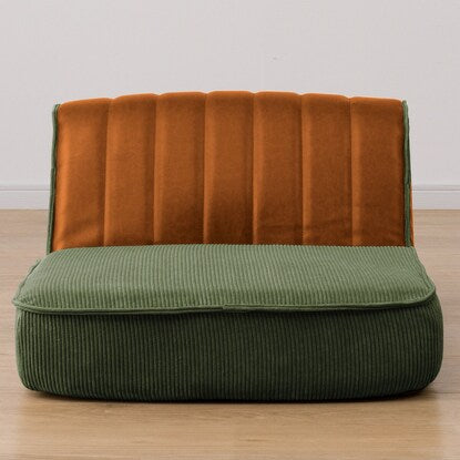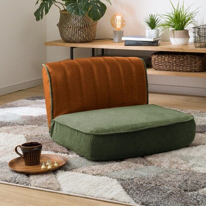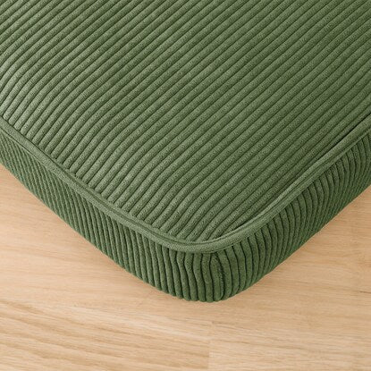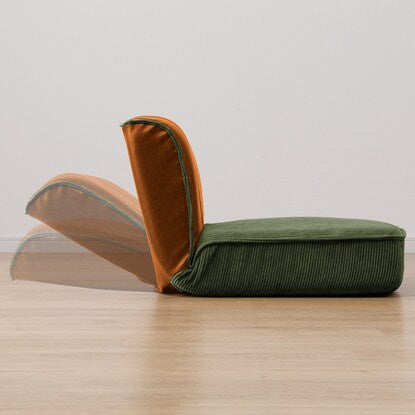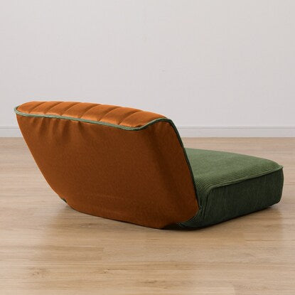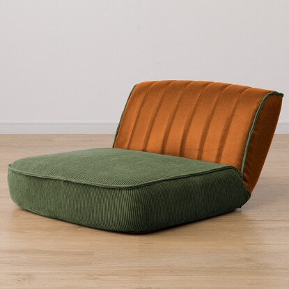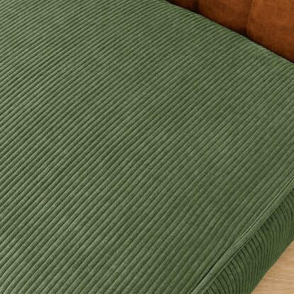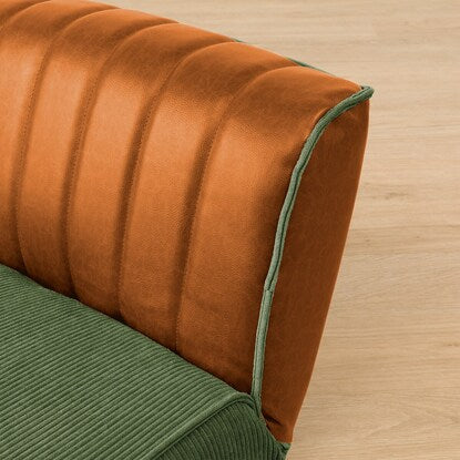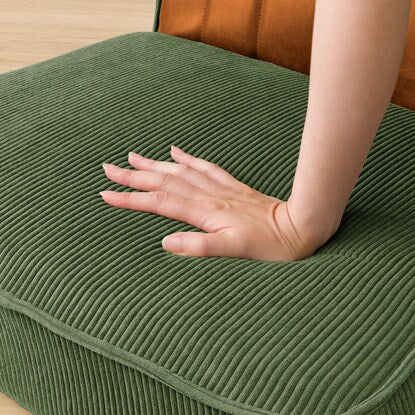 座面には高級感あふれるコーデュロイ素材をふんだんに使って、汗などかきやすい背もたれにはPVC素材を、エッジは同じコーデュロイでポイント入れ。