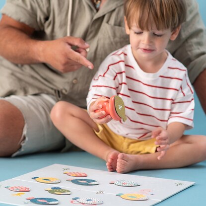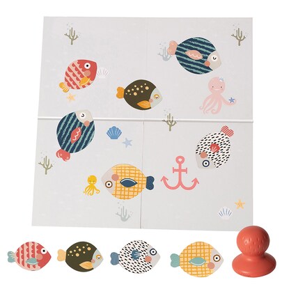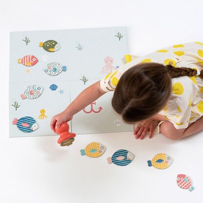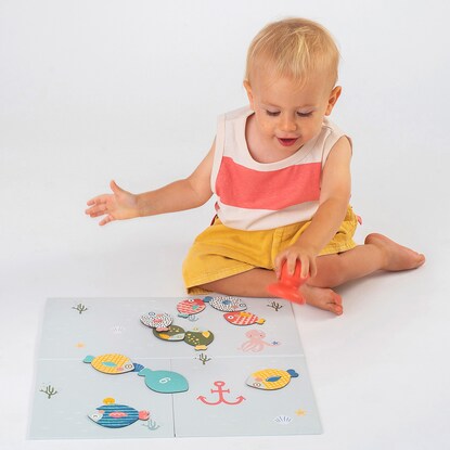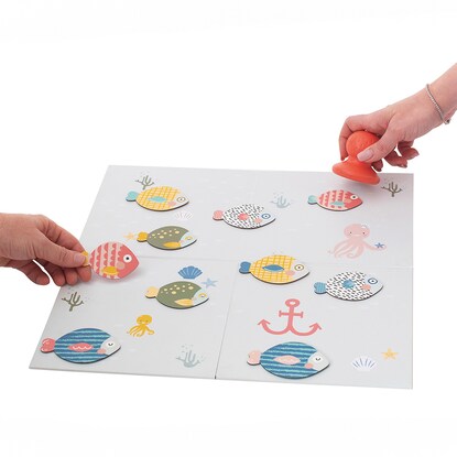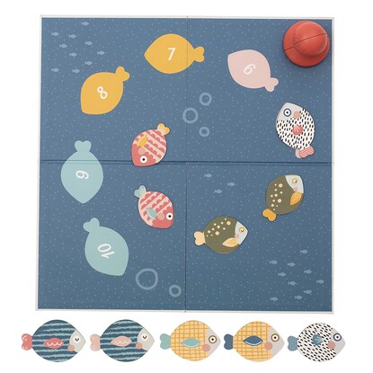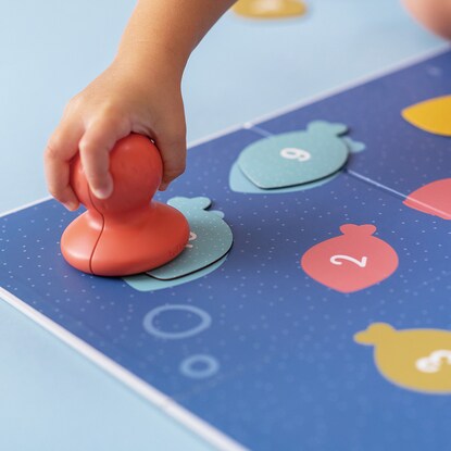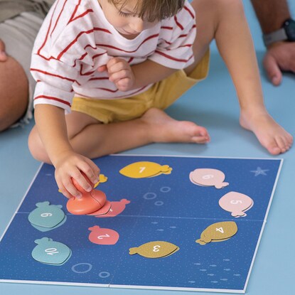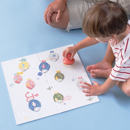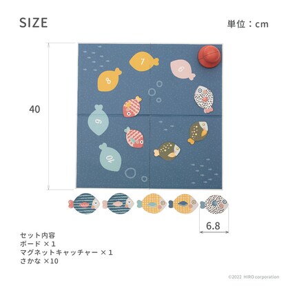ボードは両面仕様で、さかなのシルエットが描かれている面にピースの色や形を合わせたり、数字の順番に捕まえたり、年齢に応じたあそびが用意されています。