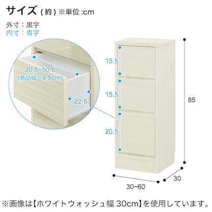 【ご注文時の注意点】 受注生産となるため、ご注文後の商品内容の変更、キャンセルはお受けできません。 商品不良を除くお客様都合による返品はお受けできません。完成品なので、届いてすぐお使いいただけます。 前面の光沢木目が美しく、スタイリッシュでお部屋の主役になる収納です。 幅30~60cmまで1cm単位でオーダー出来る引き出し。キャビネットとの組み合わせでカウンター下などのデッドスペースや、ちょっとした隙間などにぴったり収まります。 高さは設置場所に合わせて70cm、85cmの2種類からお選びいただけます。 奥行30cmのスリムタイプ。 引き出しはスライドレール付きで開閉がラク。 前面は光沢素材のため、お手入れも簡単です。 2色からお選びいただけます。 前板:ホワイトウォッシュ色:艶あり木目 グレー系ナチュラル:艶なし木目※ご注文の際は余裕を持って、実寸より1cm以上引いた幅の商品をお選びください。 <同シリーズはこちら>※使用している小物等は演出品です。