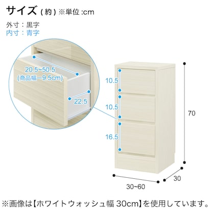 【ご注文時の注意点】 受注生産となるため、ご注文後の商品内容の変更、キャンセルはお受けできません。 商品不良を除くお客様都合による返品はお受けできません。完成品なので、届いてすぐお使いいただけます。 前面の光沢木目が美しく、スタイリッシュでお部屋の主役になる収納です。 幅30~60cmまで1cm単位でオーダー出来る引き出し。キャビネットとの組み合わせでカウンター下などのデッドスペースや、ちょっとした隙間などにぴったり収まります。 高さは設置場所に合わせて70cm、85cmの2種類からお選びいただけます。 奥行30cmのスリムタイプ。 引き出しはスライドレール付きで開閉がラク。 前面は光沢素材のため、お手入れも簡単です。 2色からお選びいただけます。 前板:ホワイトウォッシュ色:艶あり木目 グレー系ナチュラル:艶なし木目※ご注文の際は余裕を持って、実寸より1cm以上引いた幅の商品をお選びください。 <同シリーズはこちら>※使用している小物等は演出品です。