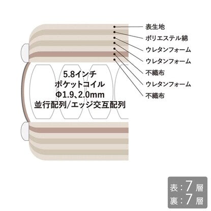 腰掛けるケースの多い両サイドは線形2.0mmのポケットコイルを交互に配列する事により、耐久性を高めています。