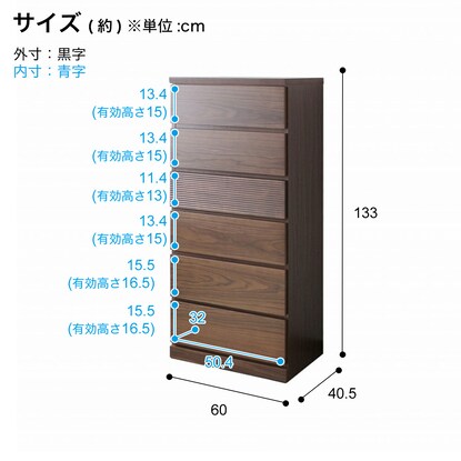 ※使用している小物等は演出品です。ライフスタイルに合わせて自分好みの収納を・・ 寝室にはもちろん、色んなお部屋に選べる収納 お部屋に合わせて組み合わせ自由、ジョイントできます 引出内寸【1・2・4段目】W30.3×D32×H13.4(有効高15)【3段目】W30.3×D32×H11.4(有効高13)【5・6段目】W30.3×D32×H15.5(有効高16.5)(cm)※全段フルオープンレール仕様 天板・側板:天然木突板