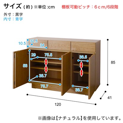 左扉内寸【観音開き】W75.7×D36.7×H56(cm)棚板2枚6cmピッチ6段階