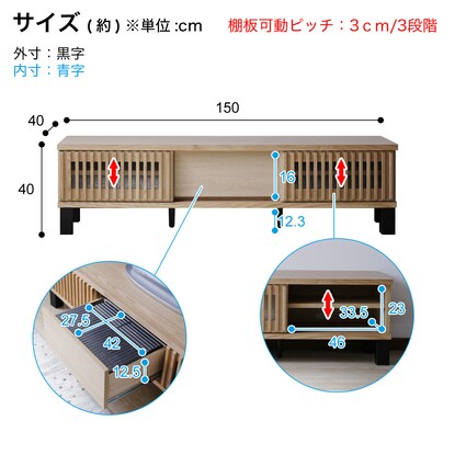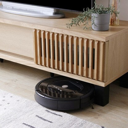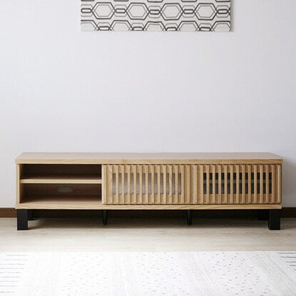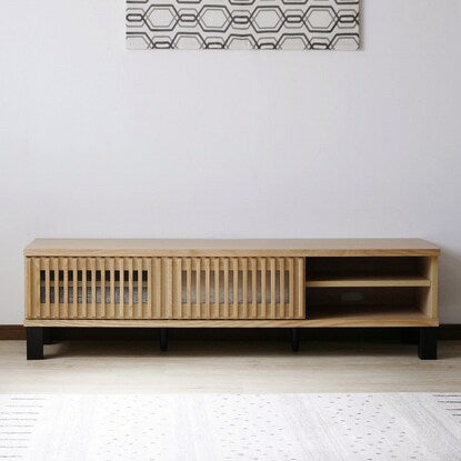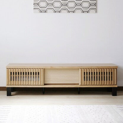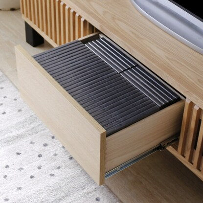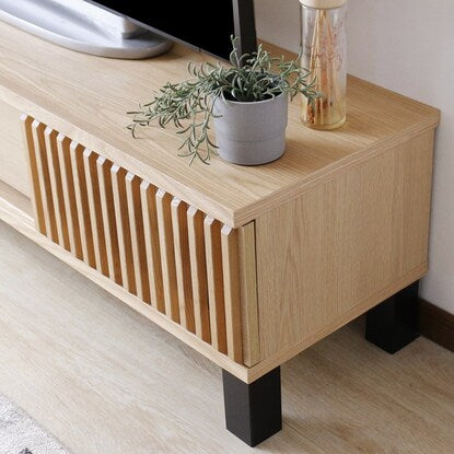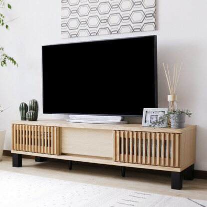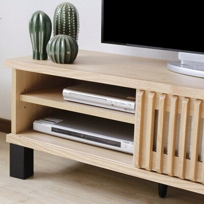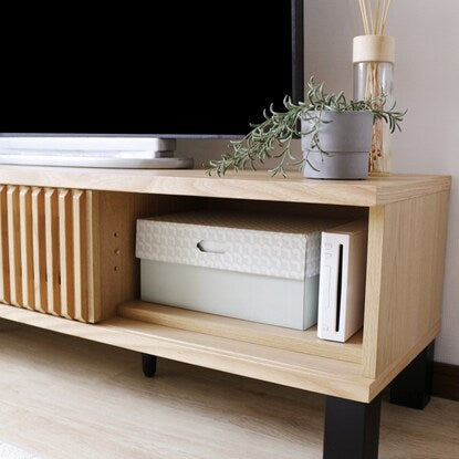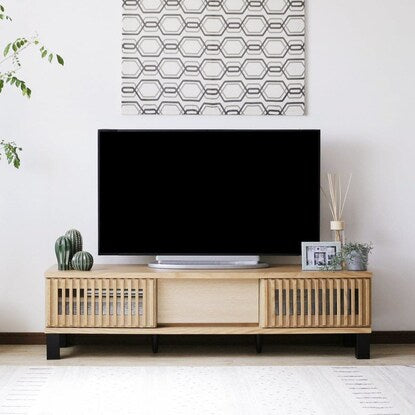 ※使用している小物等は演出品です。天然木の優しさを感じるデザイン家具 場所を取らない引き戸タイプ ブラックの脚がテレビボードを引き立ててくれます 引き出しはDVDケースを収納できる高さで約38枚収納できます 引き戸内側にはガラス入りなのでリモコン操作も可能 引き戸内には各1枚棚板がありますが、取り外し可能なのでルーターなどの収納もできます 後方に天板を5mm出していますので幅木よけ機能も備わっています 天板には配線コードを逃がせるようキリカギ加工を施しています天板:天然木突板 前板・内部:プリント化粧合板 脚・縦格子:アッシュ無垢