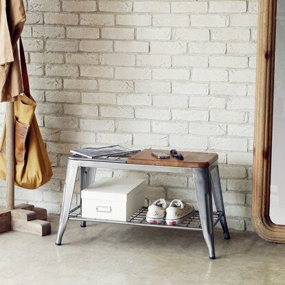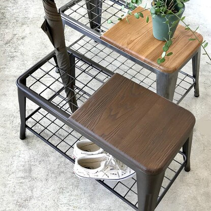 ※使用している小物等は演出品です。玄関先に置ける傘立て付きスリムベンチ 強度を持たせた完成品 傘や杖も収納できます 腰掛けて靴を履ける座面木部:幅39×奥行31×高さ2.5cm(約)