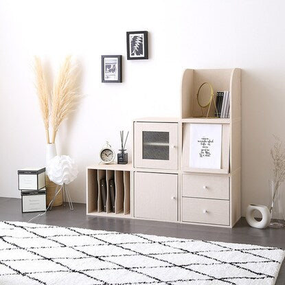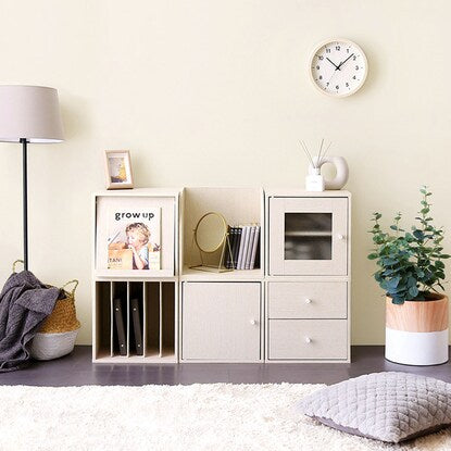 一つで使ったり、積み重ねたり、気軽に形を変えられて模様替えが楽しめる木目調キューブラックです。