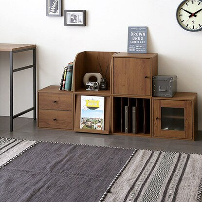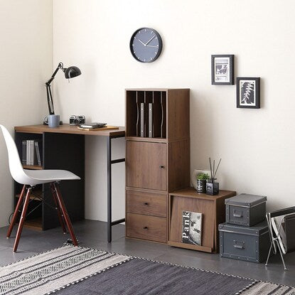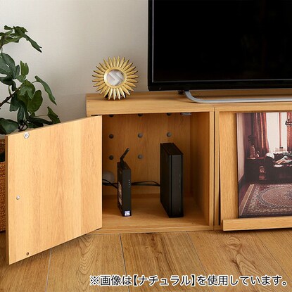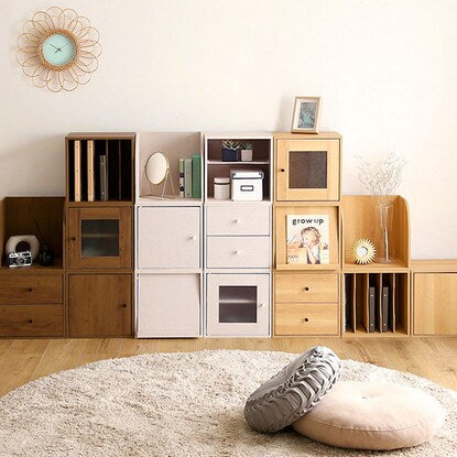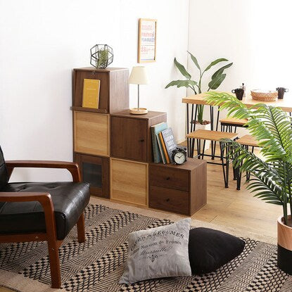 一つで使ったり、積み重ねたり、気軽に形を変えられて模様替えが楽しめる木目調キューブラックです。