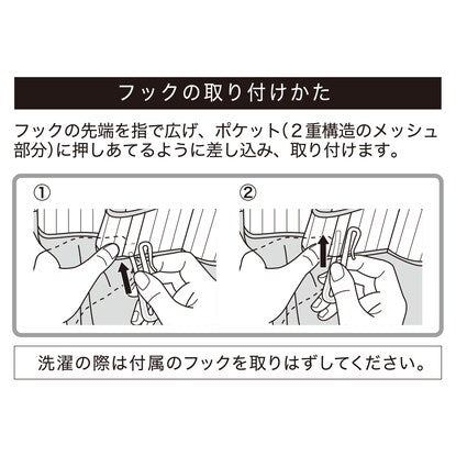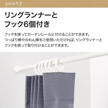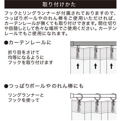 フックを使ってカーテンレールに付けることができます。つっぱり棒やのれん棒をご使用いただければ、リングランナーとフックを使って取り付けることができます。