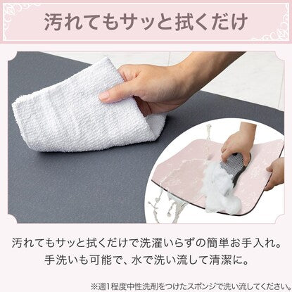 汚れてもサッと拭くだけで洗濯いらずの簡単お手入れ。手洗いもできるので、汚れが気になる場合は週に1回程度中性洗剤をつけたスポンジで洗い、水で流していつでも清潔に使える。
