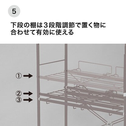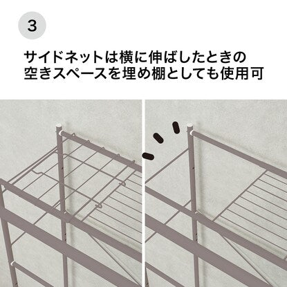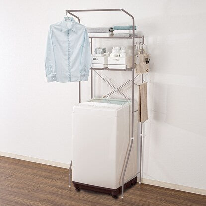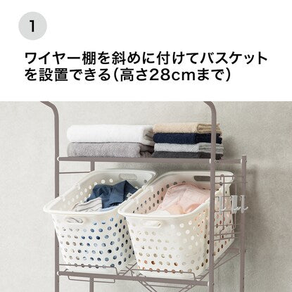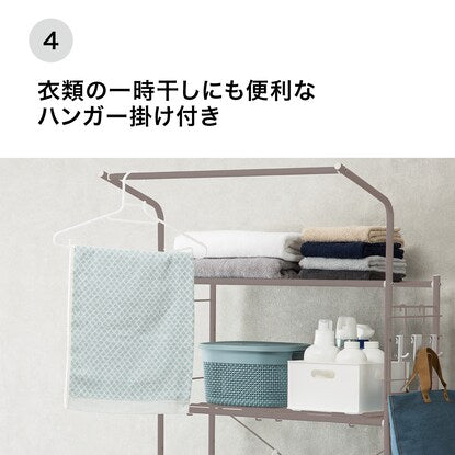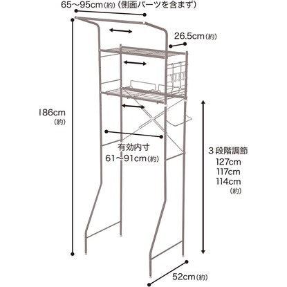 衣類も掛けられてサイドも有効に使える洗濯機ラック ワイヤー棚を斜めに付けてバスケット(別売品)を設置できる ※高さ28cmまで ワイヤー棚はサイドネットとしても使用可能 ※フック4個付き サイドネットは横に伸ばしたときの空きスペースを埋め棚としても使用可能 衣類の一時干しにも便利なハンガー掛け付き 下段の棚は3段階調節で置く物に合わせて有効に使える ※高さ3段階(約):127cm/117cm/114cm 工具在中全体:幅65~95×奥行52×高さ186cm(側面パーツを含まず) 有効内寸幅:61~91cm【耐荷重(約)】 全体:12kg ハンガー掛けバー:4kg 固定棚:5kg 可動棚:3kgパイプ・棚板:スチール(エポキシ樹脂粉体塗装) タオルバー:スチール(エポキシ樹脂粉体塗装) ねじ:スチール その他樹脂パーツ:ポリプロピレン ※「デコホーム」は、ニトリから生まれたインテリア雑貨のお店です。普段使いの日用品からお部屋のアクセントになるアイテムまで品質やデザインはもちろん、お手軽な価格で取り揃えています。