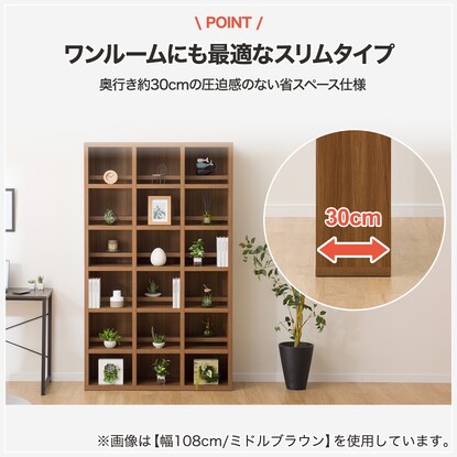 たっぷり入る大型本棚ですが、奥行き30cmのスリムタイプなので、お部屋に圧迫感を与えずに使えます。