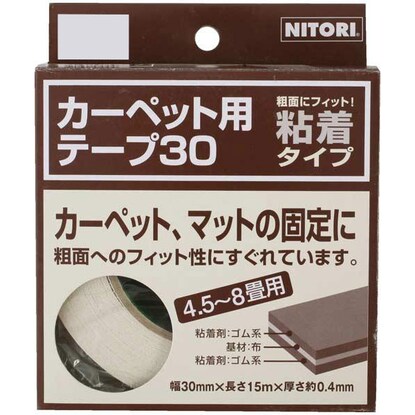 カーペット、マットの固定に粗面へのフィット性にすぐれています。 滑り止めテープ。■主な用途 カーペット・マットの固定に 広告・ポスターなどの貼りつけに※ご使用上の注意 はがすときに貼りつけ面を傷めたり、のりが残ることがありますので、 跡が残っても差し支えない所を選んで使用してください。 (フローリング床は、はがずときに表面を傷めやすいため、使用できません。) ふっ素処理などで、はくりしやすい面、はがれやすい塗装面などや、 また高温や水分にさらされる場所には使用できません。4.5~8畳用 幅30mm×長さ15m×厚さ約0.4mm