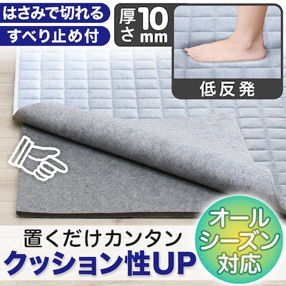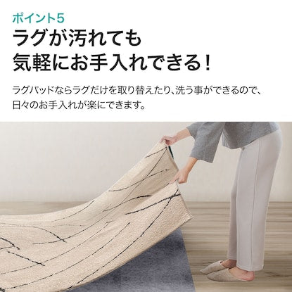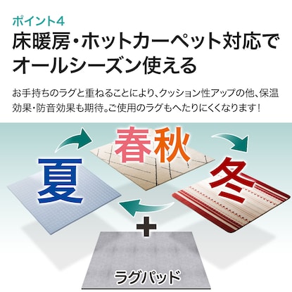 ※画像はイメージです。 ポイント1 ご使用のラグにプラスしてクッション性アップ! 小さなお子さまやペットがいるとラグは汚れる頻度も高いもの。そんなときは上部に洗える薄手のラグ、その下にこちらの低反発パッドを敷けばクッション性を保ちつつ、汚れたラグはキレイにできます。 ポイント2 裏面は滑り止め加工で滑りにくい 裏面に滑り止め加工しているのでズレにくく、安心です! ポイント3 ハサミでカットできるのでサイズの幅が広がる ぴったりのサイズが見つからなくても、お手持ちのラグより大きめのサイズをお買い求めいただき、ハサミでカットすればぴったりの大きさに♪ ポイント4 床暖房・ホットカーペット対応でオールシーズン使える 一年中使える!お手持ちのラグと重ねることにより、クッション性アップの他、保温効果・防音効果も期待。ご使用のラグもへたりにくくなります! ラグサイズ 130×185cm(約)用ご使用のラグにプラスして、クッション性アップ! はさみで切れる! ご使用のラグがへたりにくい 裏面すべり止め付き 床暖房・ホットカーペット対応■組成 表生地:不織布ポリエステル100% 充填物:ウレタンフォーム 裏生地:不織布ポリエステル100% すべり止め:塩化ビニル樹脂■(洗濯不可)※お取り扱い上のご注意 ご使用環境やご使用方法により塩化ビニル・フローリング等、床材の変色が起こることがあります。 開封直後は素材特有のにおいがあります。気になる場合は、風通しの良い場所で半日ほど陰干しをおこなってください。においが軽減されます。 ご使用のラグの下に使用した場合、ラグ自体がめくれやすくなることがあります。走ったりすると転倒するおそれがあります。ご注意ください。 パッケージの形状でしばらくは折りじわが発生します。2~3日程度でなじみますが、つまずき等の転倒にご注意ください。 アイロンのご使用はお止めください。 表面を強くこすると色移りする場合があります。白い衣類等は、ご注意ください。 床暖房の種類によっては、ご使用いただけない場合があります。お使いの床暖房の取扱説明書をご確認ください。場合によっては製品・床材の変色など起こることがあります。長時間敷いたままでのご使用はさけてください。