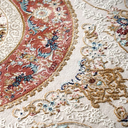 シュリンク糸を使用する事で表面に立体感を出しています かわいらしいクラシック柄 汚れが付着しにくく、遊び毛や毛玉が出にくいポリプロピレン糸を使用しています 縦糸にジュート糸が使われており、抗菌防臭、消臭効果があります
