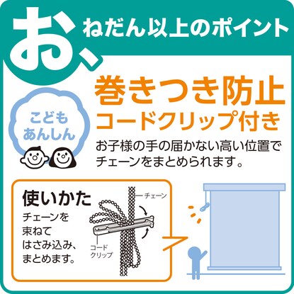 光を取り入れる 採光ロールスクリーン ・適度に光を取り入れる採光タイプ ・窓だけでなく部屋の間仕切りなどにもお勧めのロールスクリーン ・スリムタイプ チェーン式 チェーン式で上げ下げラクラク! 手前のチェーンを引けば上がり、奥のチェーンを下げれば降ります。 巻きつき防止コードクリップ付き チェーンが体に巻きついたり、ひっかからない! お子様の手の届かない位置にチェーンを束ねるクリップです。 詳細サイズ ※サイズ(約) ※単位:cm 天井付け・正面付け・ カーテンレール付け可能 ※ブラケットは両端に2個設置しますが、165cm、180cm幅の商品については、ブラケットを両端と中央の3個設置します。 ※画像はイメージです。 詳しくは取扱説明書をご覧ください。 ■材質 フレーム:アルミニウム 生地:ポリエステル100%