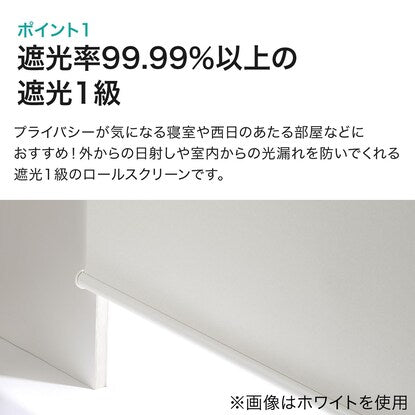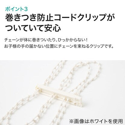 外からの日射しや室内からの 光漏れを防ぐ遮光タイプ ・外からの日射しや室内からの光漏れを防ぐので、プライバシーが気になる寝室などにおすすめ! ・遮光1級 遮光率99.99%以上(人の顔の表情が識別できないレベル) チェーン式 チェーン式で上げ下げラクラク! 手前のチェーンを引けば上がり、奥のチェーンを下げれば降ります。 巻きつき防止コードクリップ付き チェーンが体に巻きついたり、ひっかからない! お子様の手の届かない位置にチェーンを束ねるクリップです。 ※画像はホワイトを使用。 詳細サイズ ※サイズ(約) ※単位:cm 画像はホワイトを使用。 天井付け・正面付け・ カーテンレール付け可能 ※ブラケットは両端に2個設置しますが、130cm、165cm、180cm幅の商品については、ブラケットを両端と中央の3個設置します。 ※画像はイメージです。 詳しくは取扱説明書をご覧ください。