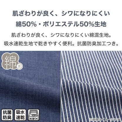 肌ざわりが良く、シワになりにくい綿混生地。吸水速乾生地で乾きやすく便利。抗菌防臭加工つき。