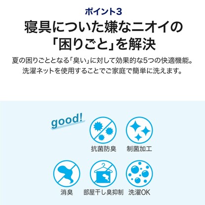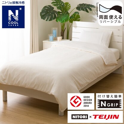 ポイント1 電気を使わずひんやり快適! 定番より冷たいNクールSP Nクールとは、ニトリが開発した触れると冷たい!と感じる「接触冷感」の生地のこと。ニトリのNクールで寝苦しい夜を快適に。 ポイント2 この一枚で長~く使える! 両面使えるリバーシブル 強冷感面と心地いいパイル面のリバーシブル。季節に合わせて使い分けできるので一年中お使いいただけます。ふとんを入れずにケットとしてもお使いいただけます♪ ポイント3 寝具についた嫌なニオイの 「困りごと」を解決 夏の困りごととなる「臭い」に対して効果的な5つの快適機能。洗濯ネットを使用することでご家庭で簡単に洗えます。 ※画像・イラストはイメージです。 ダブルサイズ【NITORI×TEIJIN】【ニトリの接触冷感(Nクールスーパー)】裏生地ふとんがズレにくい「ナノフロント®」生地を裏返し面の上下に使用 ひもなしラクラクなのでカバーの付け替え簡単! 両面使えるリバーシブル 抗菌防臭(裏生地) 制菌加工(裏生地) 部屋干し臭抑制(裏生地) 消臭加工(裏生地) 出し入れ簡単!全開ファスナー スリット付き■組成 表生地:パイル ポリエステル80%、レーヨン20% 地糸 ポリエステル100% 裏生地:ポリエステル45%、ナイロン43%、レーヨン12% 滑りにくい部分(内側):ポリエステル100%■洗濯機OK(ネット使用)こちらは掛けふとんカバーのみの販売です。