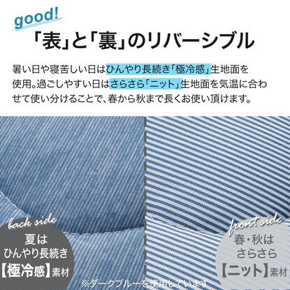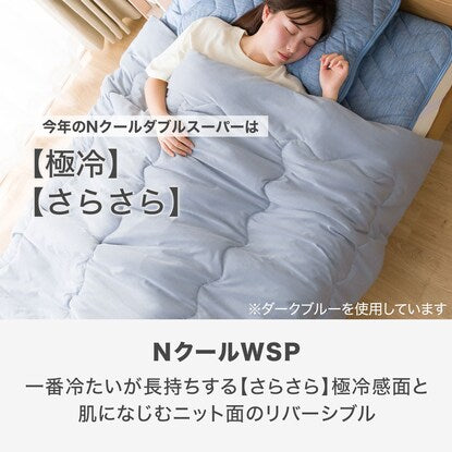 NクールWSP 冷たいが長持ちする【さらさら】極冷感面と 肌になじむニット面のリバーシブル 「表」と「裏」のリバーシブル 暑い日や寝苦しい日はひんやり長続き「極冷感」生地面を使用。過ごしやすい日はさらさら「ニット」生地面を気温に合わせて使い分けることで、春から秋まで長くお使い頂けます。 PCM加工で冷たさ長持ち 「極」冷感が長続きするPCM加工つき!(冷感生地の下の不織布に加工) 吸熱・放熱機能により快適な温度を保ちます。汗っかきなお子さまや暑がりの方のかたにおすすめです。 6つの快適機能 夏の困りごととなる「臭い」に対して効果的!洗濯ネットを使用することでご家庭で簡単に洗えます。 お好みの「肌ざわり」から選ぶ 「表」と「裏」 異なる素材と肌ざわり! ※画像はイメージです。ブルーを使用しています。シングルサイズ【ニトリの接触冷感(Nクールダブルスーパー)】裏生地吸放湿わた(中わた) 抗菌防臭(裏生地) 制菌加工(裏生地) 消臭 部屋干し臭抑制(裏生地) 洗濯OK 両面使えます■組成 表生地:ポリエステル100% 充填物:上層 ポリエステル75%、合成繊維(アクリレート)25% 下層 ポリエステル100% 不織布:レーヨン50%、ポリエステル50%(PCM加工) 裏生地:ナイロン55%、複合繊維(ナイロン、ポリエチレン)38%、ポリウレタン7%■洗濯機OK(ネット使用)